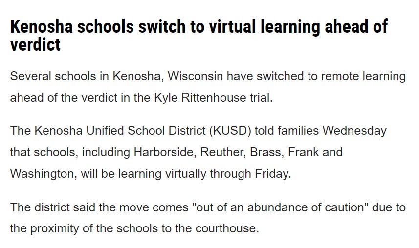 And then there’s Kenosha, Wisconsin. They are shifting to remote learning out of an abundance of caution. Schools have been closed this week in anticipation of a verdict in the Rittenhouse case.